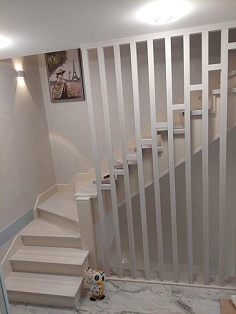 Характеристики Тип: любая конфигурация (прямая, Г-образная, П-образная) Материал: массив сибирской лиственницы (категория Экстра или А) Толщина ступеней: 40–50 мм Покрытие: твердое масло с воском или износостойкий яхтный лак Ограждения: дерево, художественная ковка или современные перила из нержавеющей стали